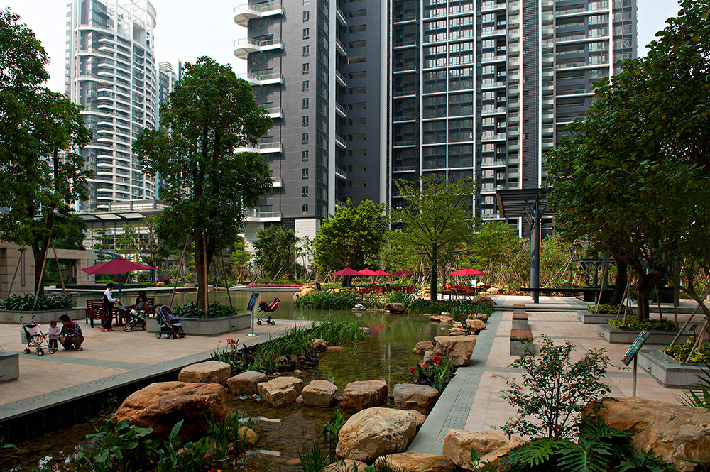 红树湾清晰而分明的规划为现代景观设计手法的运用提供了条件,景观依此极富肌理地生长。奥雅让社区拥有大尺度的园林体验,恢复和挖掘“红树湾”本身名称中代表的良好生态环境意义,在社区内设置人工湖,在湖边抽象再现了红树生长、鸟类栖息所需要的湿地。沿南北两边长达300米的景观轴线,颇具形态的长绿树种形成了绿色走廊,空间自然地得到了延伸和统一。