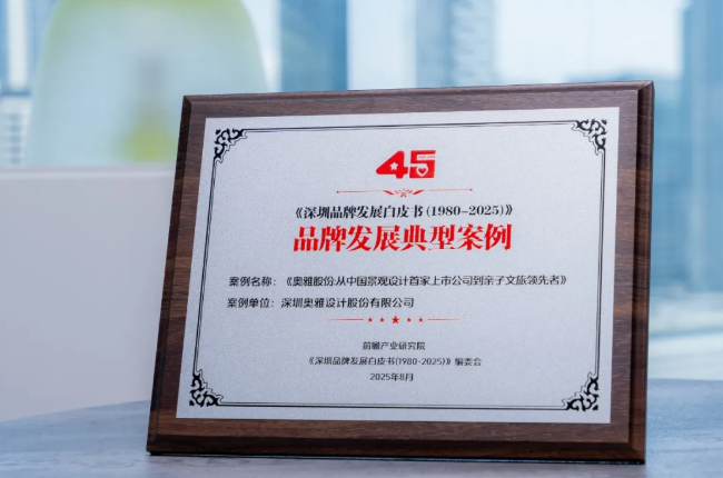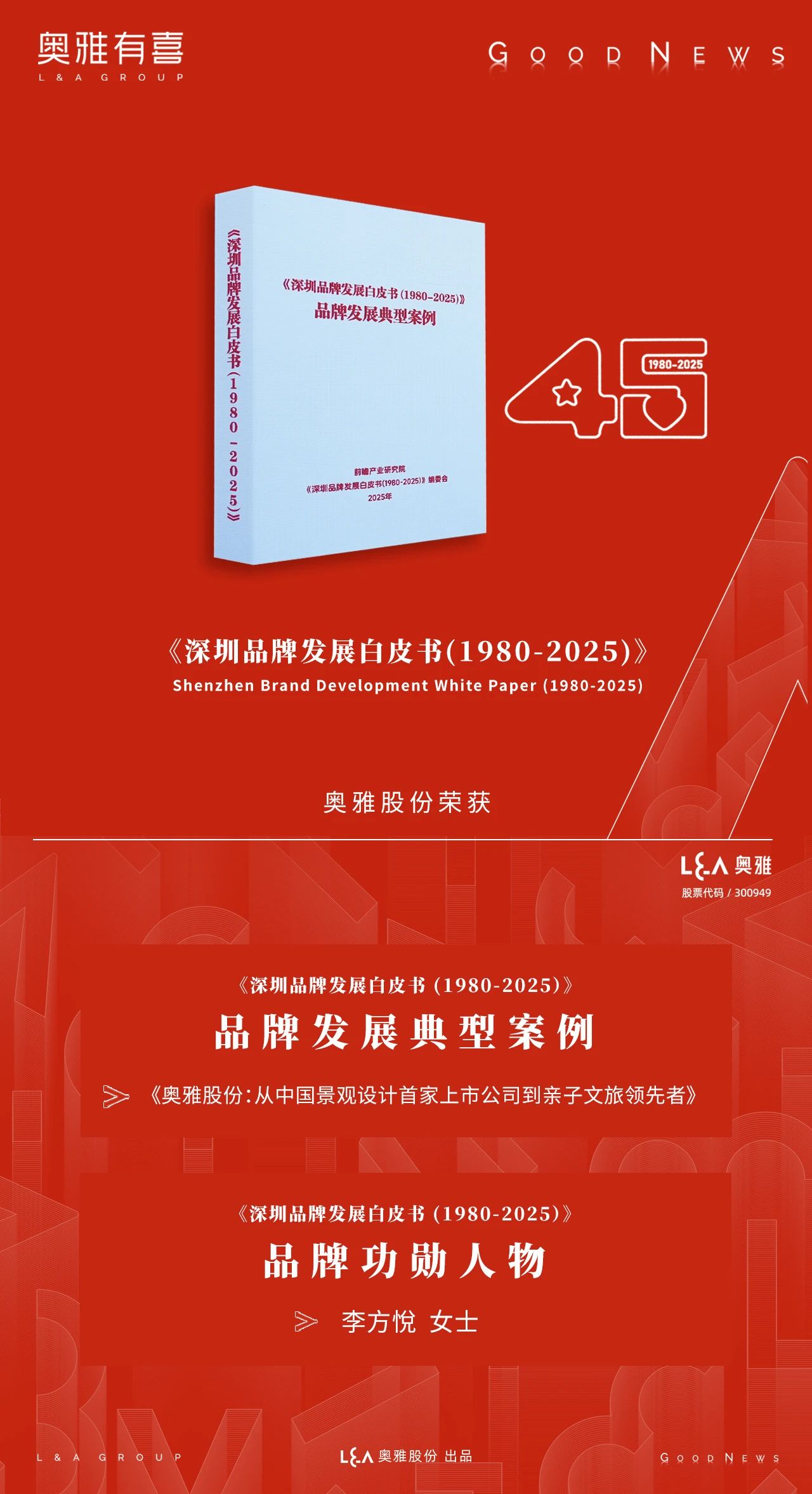 近日,2025(第十九届)中国品牌节在深圳圆满落幕,前瞻产业研究院发布了《深圳品牌发展白皮书(1980-2025)》,奥雅股份(股票代码:300949)提报的《奥雅股份:从中国景观设计首家上市公司到亲子文旅领先者》品牌发展案例成功入选“深圳45年品牌发展典型案例”,奥雅股份联合创始人 董事 总裁、洛嘉儿童品牌创始人 李方悦女士荣膺“品牌功勋人物”。