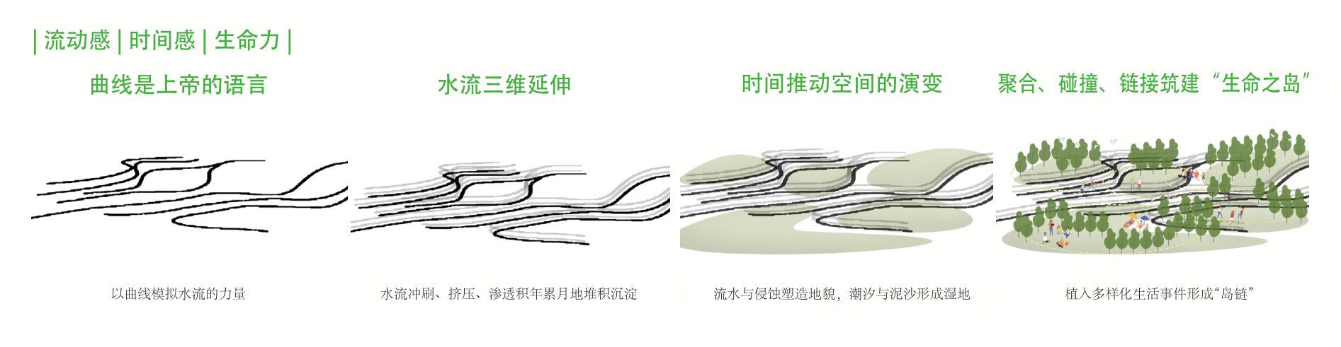奥雅股份的设计团队以“流水与侵蚀塑造地貌,潮汐与泥沙形成湿地”作为设计主旨,溯源在地生境,以时间推动空间的演变体现流动感、时间感、生命力。