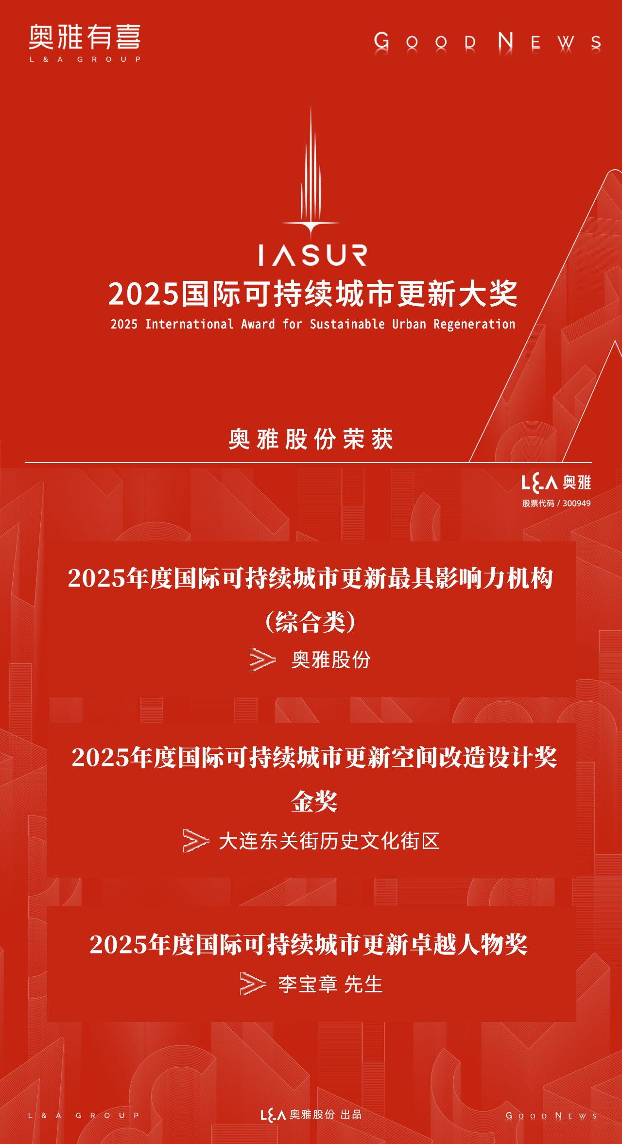 近日,2025年度国际可持续城市更新大奖正式揭晓。奥雅股份(股票代码:300949)凭借在城市更新领域的长期深耕与可持续创新实践,一举包揽三项重磅荣誉,以全维度实力印证行业标杆地位。公司荣获“2025年度国际可持续城市更新最具影响力机构(综合类)”;奥雅股份创始人、董事长兼首席设计师 李宝章 先生荣膺“2025年度国际可持续城市更新卓越人物奖”;奥雅股份作品大连东关街历史文化街区摘得“2025年度国际可持续城市更新空间改造设计奖-金奖”。