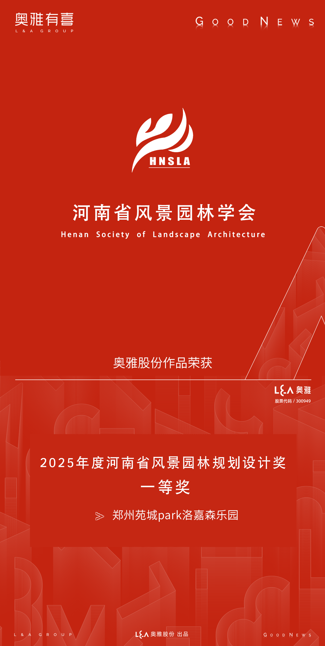 近日,由河南省风景园林学会主办的“2025年度河南省风景园林规划设计奖”评选结果正式公布。奥雅股份(股票代码:300949)作品 “郑州苑城park洛嘉森乐园”凭借在遗址文化活化、生态景观营造与儿童友好空间设计的深度融合与卓越实践,荣获2025年度河南省风景园林规划设计奖一等奖。今年8月,项目亦成功斩获第八届“玉猴奖”2025年度十佳文旅消费创新奖。