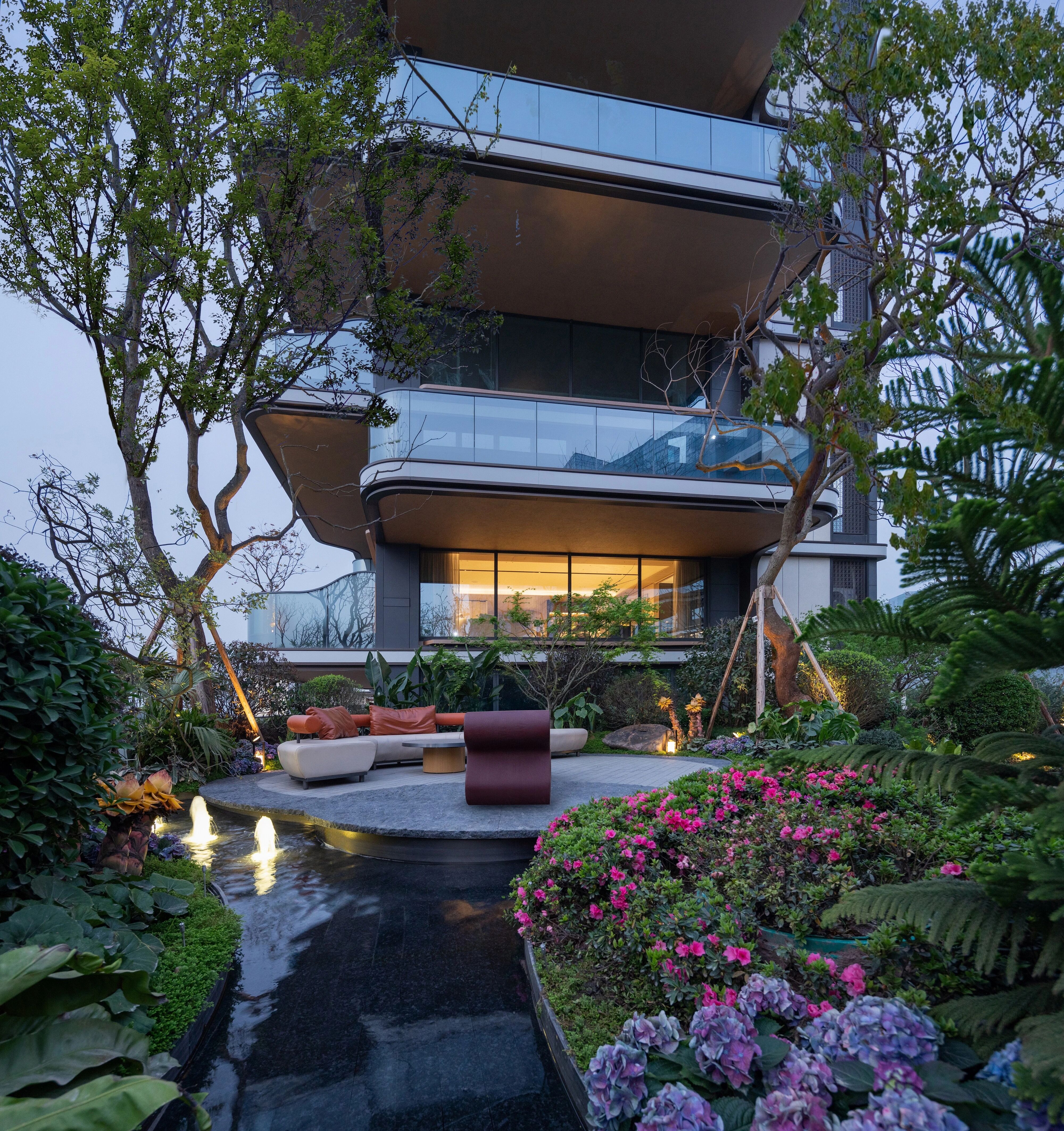 重庆金茂·璞印金开坐落于金山公园山脊之上,巧妙结合原生山体,形成约25-120米城市地平线高差。奥雅设计团队则以”自然体验·臻享生活”为设计理念,围绕立体·自然·雅奢三大元素,运用光影·材质·自然·渗透四大设计语言,营造如璞玉般,生于自然,融于自然的奢居生活。