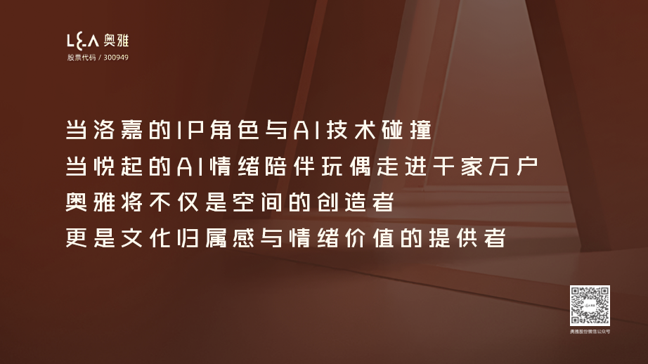 未来,奥雅将继续深耕“本土文化+科技赋能”的确定性赛道。我们期待,有更多像唐山皮影乐园、大筒仓、衢州严家淤岛综合文旅目的地这样的作品,在存量更新的土壤上生根发芽;我们坚信,当洛嘉的IP角色与AI技术碰撞,当悦起的AI情感陪伴玩偶走进千家万户,奥雅将不仅是空间的创造者,更是文化归属感与情绪价值的提供者——这不是未知的新大陆,而是我们以创意为笔、以科技为墨,在文化沃土上持续耕耘的必然成果。