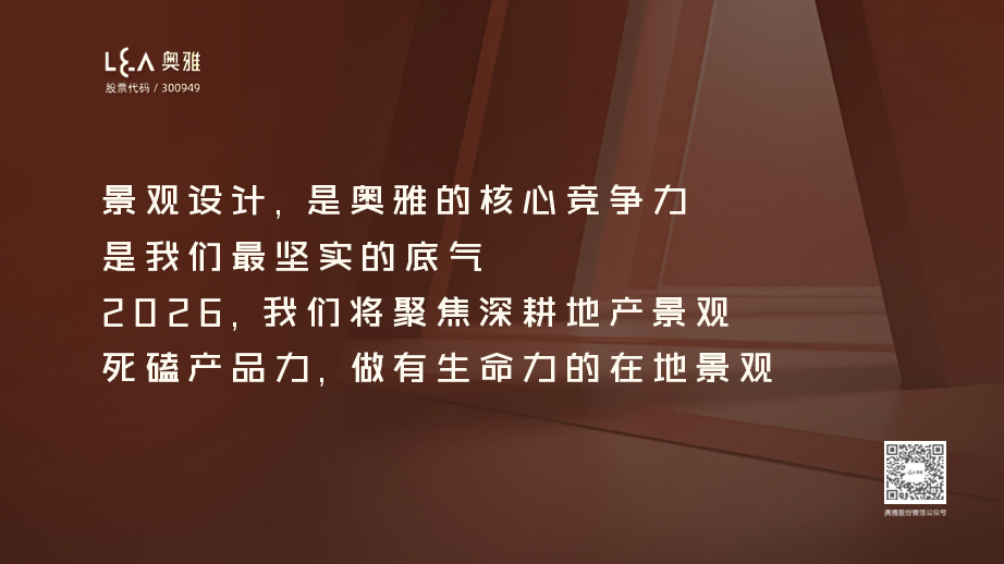 近期全国地产会议的分享与互动也印证,奥雅的地产景观板块仍有稳固根基与完整基本盘,和深厚的文化景观积淀和创新传统。2026年,我们将聚焦深耕地产景观这一核心主业,死磕产品力,做有生命力的在地文化景观,以“颠覆式创新,移动端传播,年轻化审美,市场化运营”为新倡议,打造适配市场与时代需求的“时尚、创新、艺术、个性化、年轻化”产品,让核心竞争力持续焕发生机。