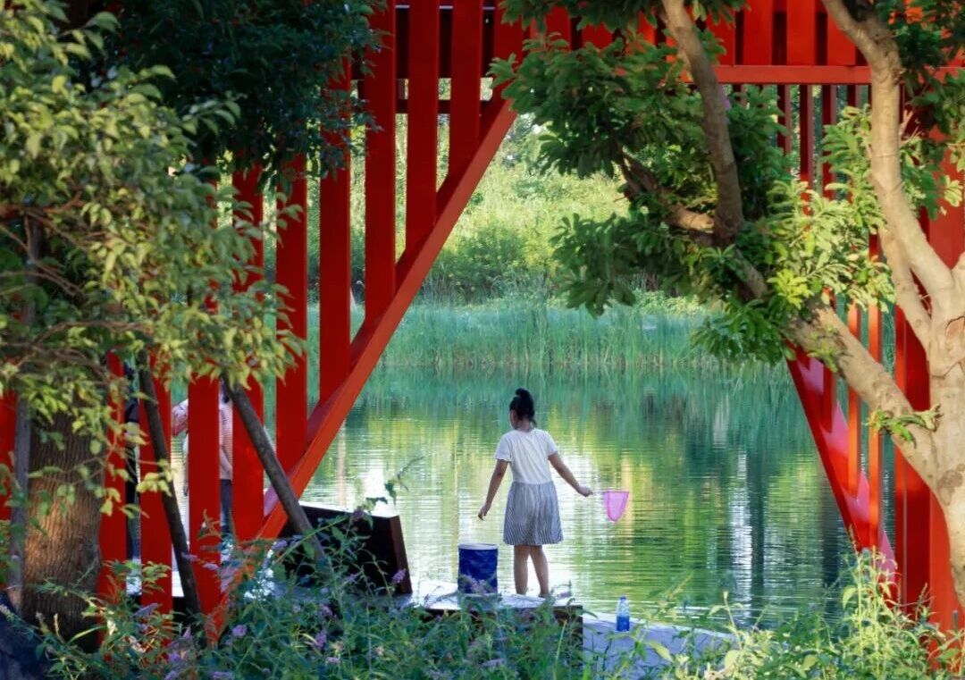 设计紧抓生态修复和人气聚集两点,提出湿地公园新玩法。一方面投入大量精力对水体进行清淤、池底塑形、水生植物种植等工程,在原有水循环系统上进行改造,加入新的泵点、物理净化、植物净化等手段。