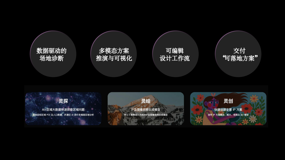 “灵探” 通过大数据分析江北新区的城市空间布局与人口画像,为项目定位提供精准的数据支撑;“灵绘” 可基于需求快速生成多版设计效果图,大幅提升设计效率,助力项目前期方案的快速迭代;“灵创” 则覆盖 IP 全流程打造,从 IP 形象设计到衍生品开发、场景落地,为江北新区文旅项目注入独特的文化符号。